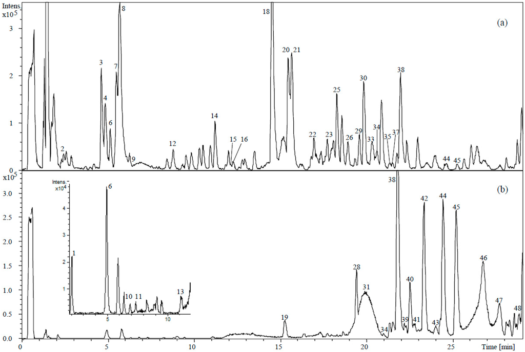 Base peak chromatogram (BPC) of ‘Arbosana’ phenolic compounds of olive fruits (a) and olive oil (b), using HPLC-DAD-TOF-MS. Proposed phenolic compounds were numbered by elution order (See Table 1 for peak numbers).