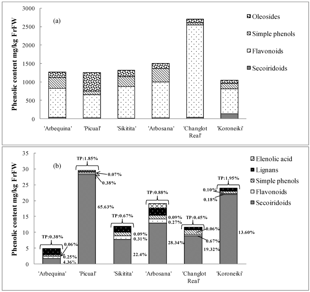 (a) Contents of subgroups of phenolic compounds in fruits of various cultivars. (b) Contents of subgroups of phenolic compounds in oils produced from the various cultivars. Rates are expressed in % of initial fresh olive fruits phenolic contents (mg/kg fresh fruits weight (FrFW)). TP (total phenol).