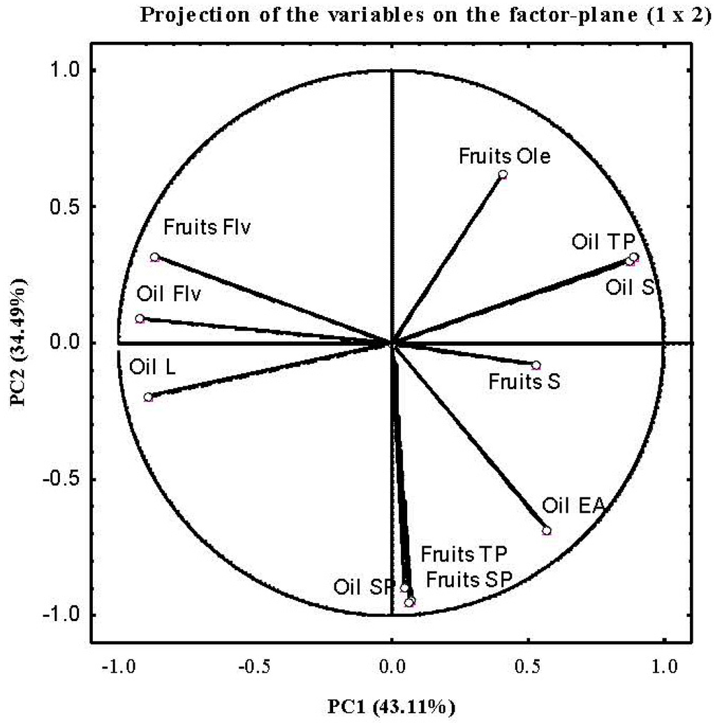 All the statistical analyses (ANOVA and principal-component analysis) were performed using Statistica 8.0 software (2001, StatSoft, Tulsa, OK, USA). Samples were collected from three trees per cultivar and all assays were run in triplicate. Significant statistical differences among treatments (p < 0.01) were assessed by Tukey’s honest significant-difference multiple comparisons. Values of different results of phenolic compounds were expressed as the means mg/kg fresh fruits weight (FrFW), and as the means mg/kg olive oil. The principal-components analysis (PCA) was performed to detect structure in the relationships between variables, allowing the classification and the separation of each cultivar.