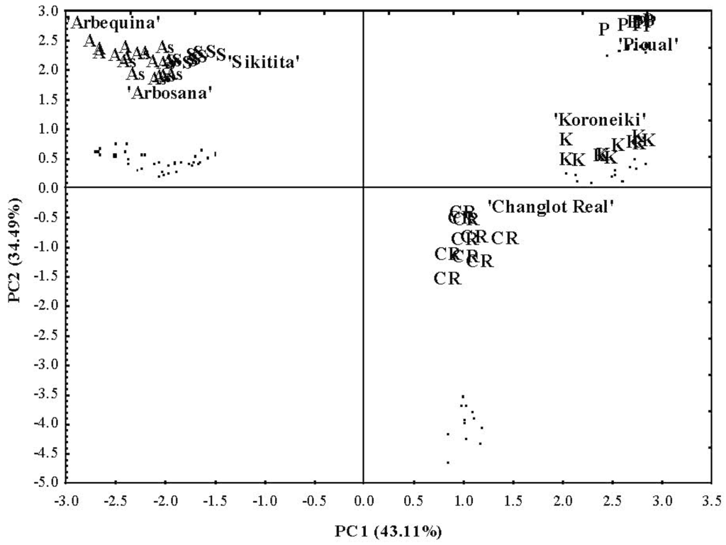 Scatter plots for the first and second principal components for the different cultivars. P (‘Picual’), K (‘Koroneiki’), CR (‘Changlot Real’), S (‘Sikitita’), As (‘Arbosana’) and A (‘Arbequina’).
