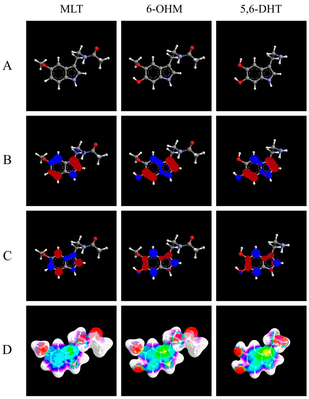 3D molecular structures of melatonin (MLT), of 6-hydroxymelatonin (6-OHM), and of 5,6-dihydroxytryptamine (5,6-DHT). (A) 3D molecular structure to note the distances between 2 oxygen atoms of 6-OHM and 2 phenolic hydroxyls of 5,6-DHT, respectively 2.77 and 2.82 Ångström (Å); (B) Frontier orbitals: HUMO (highest occupied molecular orbital); (C) Frontier orbitals: LUMO (lowest unoccupied molecular orbital); (D) Electrostatic Potential Surfaces (ESP). The geometry of the systems has been optimized considering the semi-empirical molecular orbital theory at the level of AM1 (Austin Model 1) and the electronic properties of the systems have been calculated by ab initio Restricted Hartree-Fock). ArgusLab 4.0.1 software (Mark Thompson and Planaria Software LLC, 2004) was used.