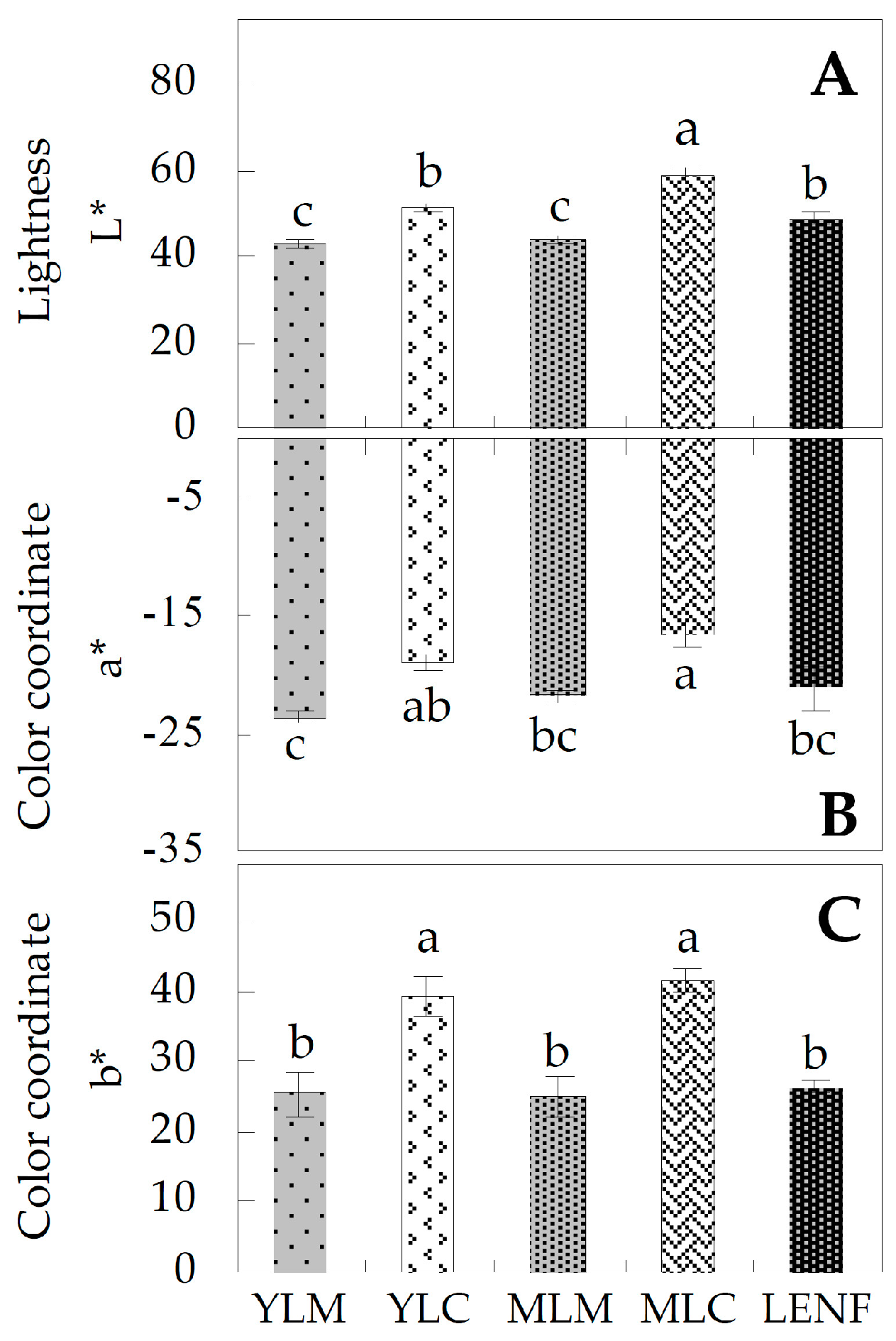 The leaf color was quantified by using a color meter (NF333 spectrophotometer, Nippon Denshoku Industries Co., Tokyo, Japan). Results were expressed according to CIELAB color coordinates system, L*, a*, and b*. L* represents the perceived lightness, and color coordinate a* and b* indicate the change in hue from red to green and from yellow to blue, respectively [99].