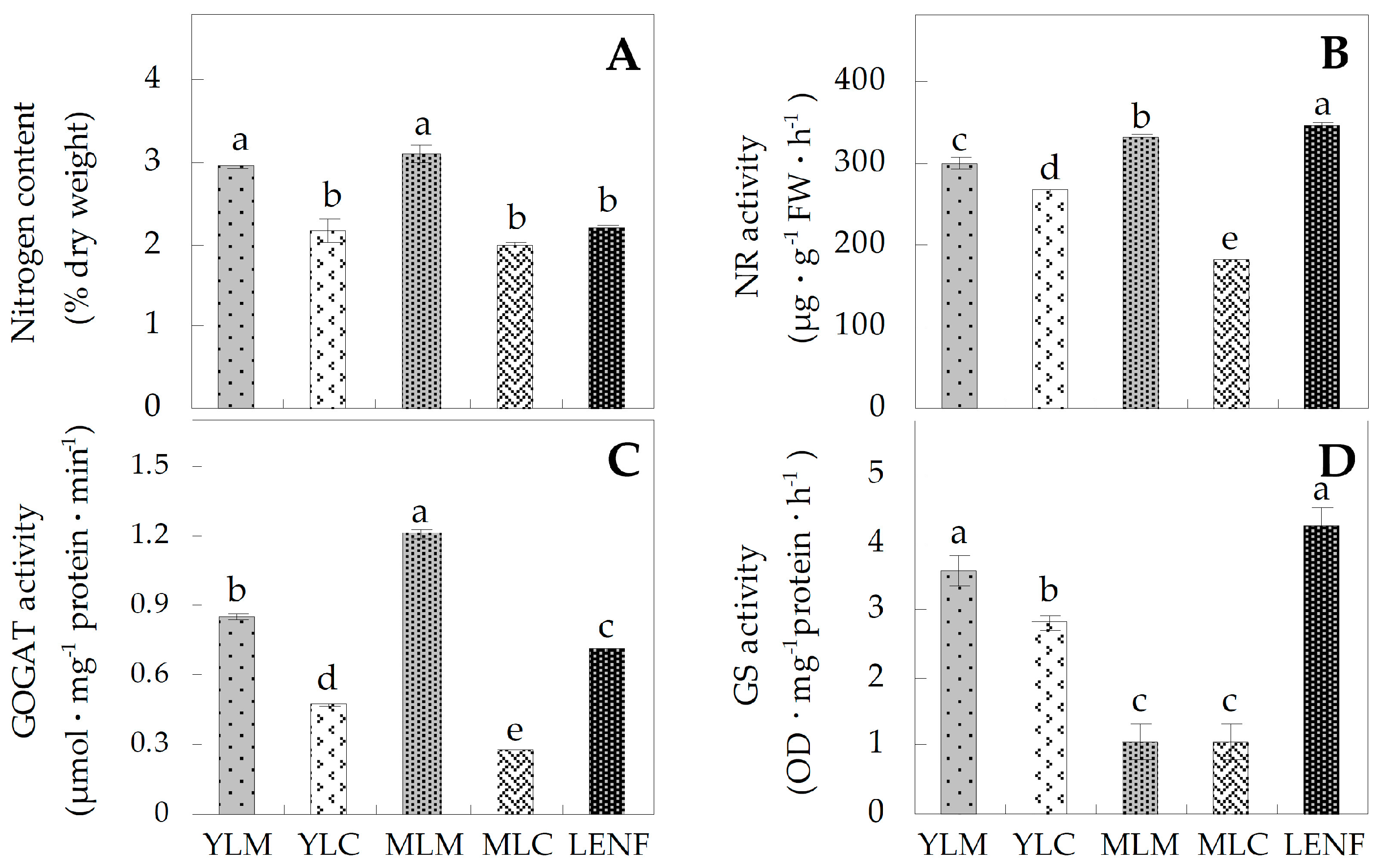 2.3. Nitrogen Contents and Activities of Nitrogen Metabolism-Related Enzymes