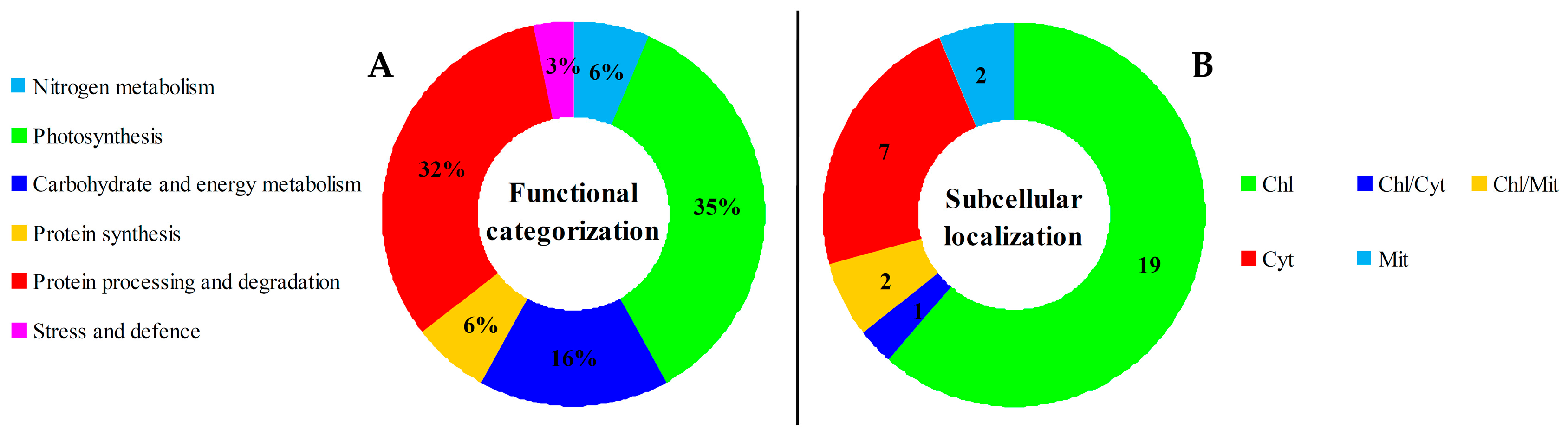 Among the 31 identified DEPs, seven were originally annotated as unknown, or hypothetical proteins. In this study, they were re-annotated according to The Basic Local Alignment Search Tool (BLAST) analysis (Table 1, and Supplemental Table S2). Taken together, based on the function information from Gene Ontology, BLAST analysis, and literature, all these proteins were mainly involved in nitrogen metabolism, photosynthesis, carbohydrate and energy metabolism, protein synthesis, protein processing and degradation as well as stress and defense (Table 1). Among them, proteins involved in protein metabolism, including protein synthesis, protein processing and degradation, accounted for the largest group (38% of DEPs) (Figure 6A).