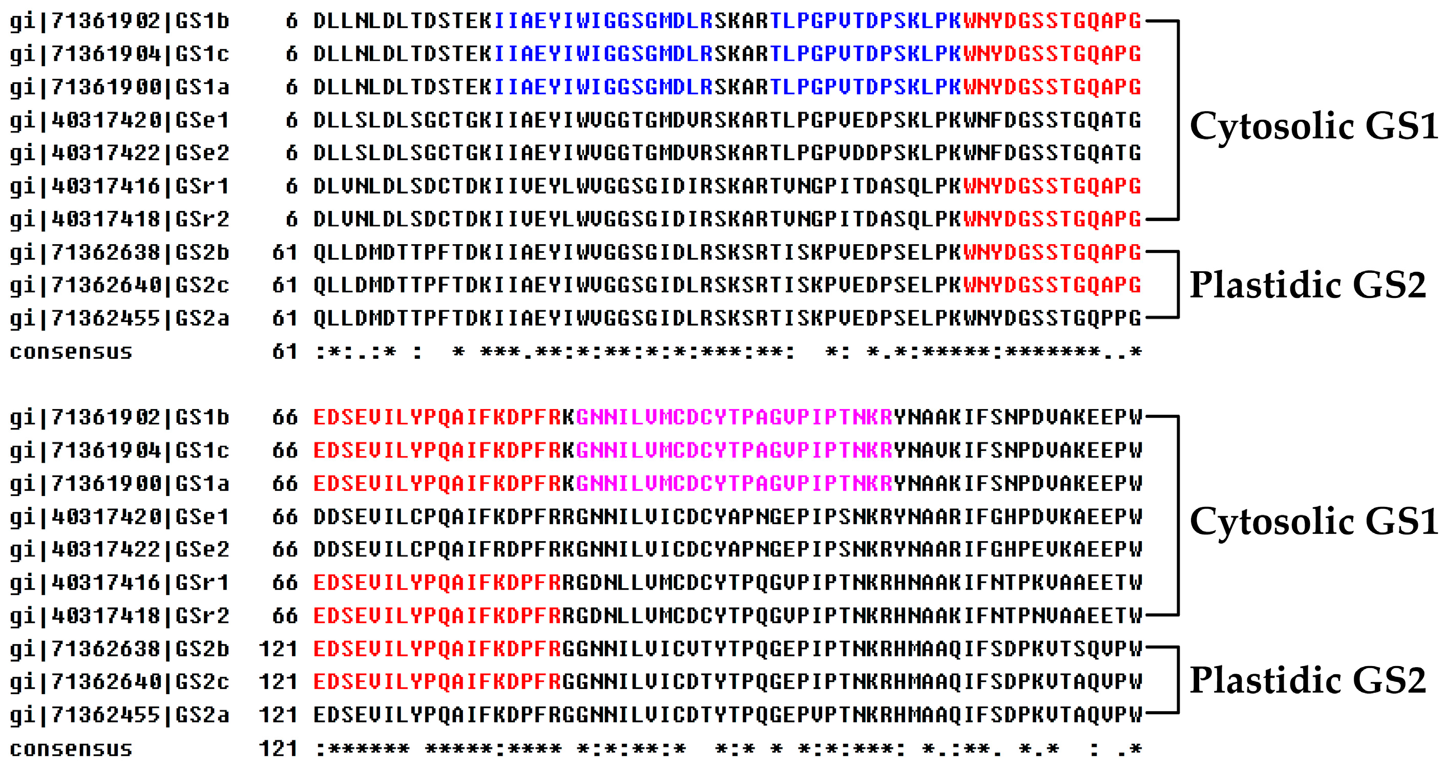 - Bernard, S.M.; Møller, A.L.B.; Dionisio, G.; Kichey, T.; Jahn, T.P.; Dubois, F.; Baudo, M.; Lopes, M.S.; Tercé-Laforgue, T.; Foyer, C.H. Gene expression, cellular localisation and function of glutamine synthetase isozymes in wheat (Triticum aestivum L.). Plant Mol. Biol. 2008, 67, 89–105. [Google Scholar] [CrossRef] [PubMed]