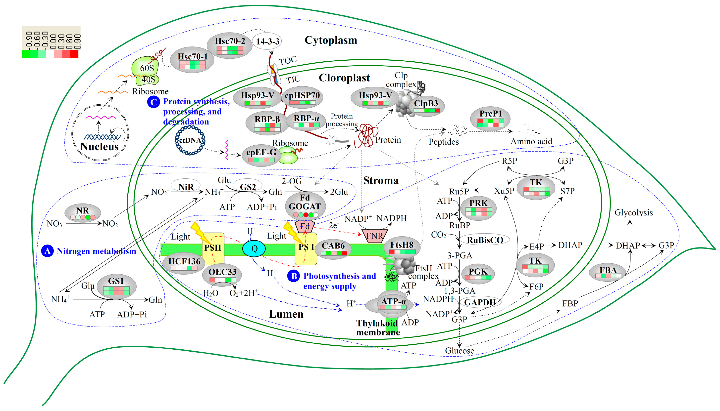 Schematic presentation of the leaf color regulation mechanism in chimera Hosta “Gold Standard” leaves. The identified proteins were integrated into subcellular pathways. A, Nitrogen metabolism; B, Photosynthesis and energy supply; C, Protein synthesis, processing and degradation. Protein expression patterns and enzyme activities are marked in the oval shapes with squares and circles in different colors, respectively. The increased and decreased proteins are represented in red and green, respectively. The color intensity increases with increasing abundant differences. The solid line indicates single-step reaction, and the dashed line indicates multistep reaction. Abbreviation: 2-OG, 2-oxoglutarate; 40S, eukaryotic small ribosomal subunit; 60S, eukaryotic large ribosomal subunit; ATP-α, ATP synthase alpha chain; CAB6, chlorophyll a/b binding protein 6; ClpB3, chloroplastic chaperone protein ClpB3; cpEF-G, chloroplastic elongation factor G; cpHsp70, stromal 70 kDa heat shock-related protein; DHAP, dihydroxyacetone phosphate; E4P, erythrose-4-phosphate; F6P, fructose 6-phosphate; FBA, fructose-1,6- bisphosphate aldolase; FBP, fructose 1,6-bisphosphate; Fd, ferredoxin; FNR, ferredoxin-NADP reductase; FtsH8, ATP-dependent zinc metalloprotease FtsH8; G3P, glycerate 3-phosphate; GAPDH, Glyceraldehyde-3-phosphate dehydrogenase; Gln, glutamine; Glu, glutamate; GS1, cytosol-localized glutamine synthetase isoform; GS2, plastid-localized glutamine synthetase isoform; HCF136, photosystem II stability/assembly factor HCF136; Hsc70, heat shock congnate 70 kDa protein; Hsp93-V, heat shock protein 93-V(ClpC1, ClpA subunit); NiR, nitrite reductase; NR, nitrate reductase; OEC33, O2 evolving complex 33kD family protein; PGA, 3-phosphoglyceric acid; PGK, phosphoglycerate kinase; PreP1, presequence protease 1; PRK, phosphoribulokinase; PSI, photosystem I; PSII, photosystem II; Q, quinine; R5P, ribose-5-phosphate; RBP, RuBisCO large subunit-binding protein subunit; Ru5P, ribulose-5-phosphate; RuBisCO, ribulose-1,5-bisphosphate carboxylase; RuBP, ribulose-1,5-bisphosphate; S7P, sedoheptulose-7-phosphate; TIC, translocon at the inner envelope membrane of chloroplasts; TK, transketolase; TOC, translocon at the outer envelope membrane of chloroplasts; Xu5P, xylulose-5-phosphate.