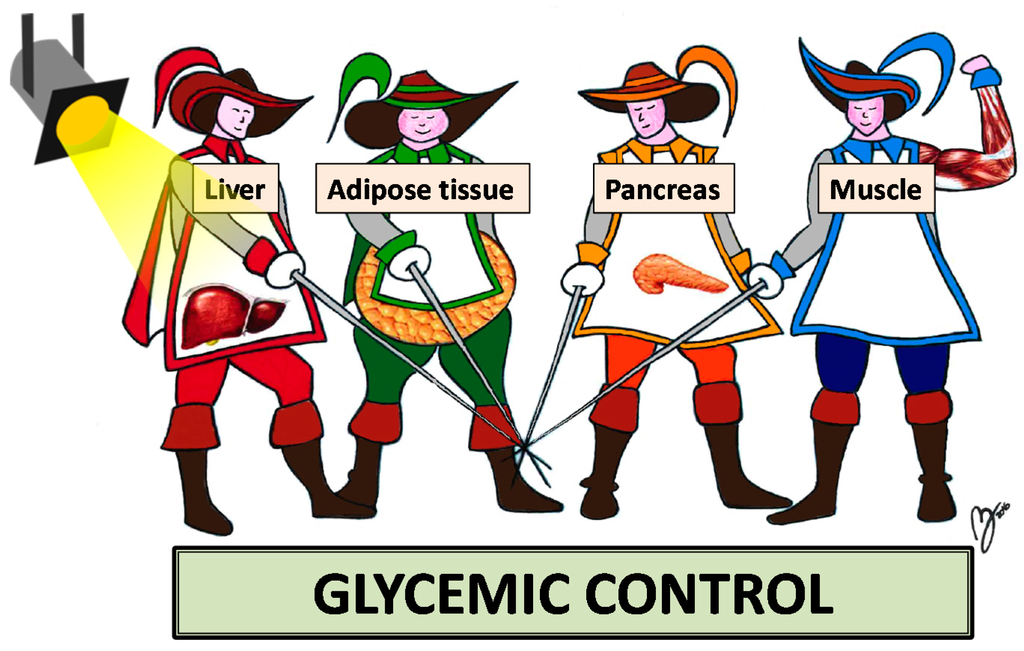 The “four musketeers” fighting for maintaining glucose homeostasis. Under normal conditions, muscle and pancreas improve glycemic control. However, an expanded adipose tissue will usually lead to dysglycemia. Similarly, fatty changes occurring in the liver will result in the development of insulin resistance. Hence, this review article puts the liver in the spotlight.