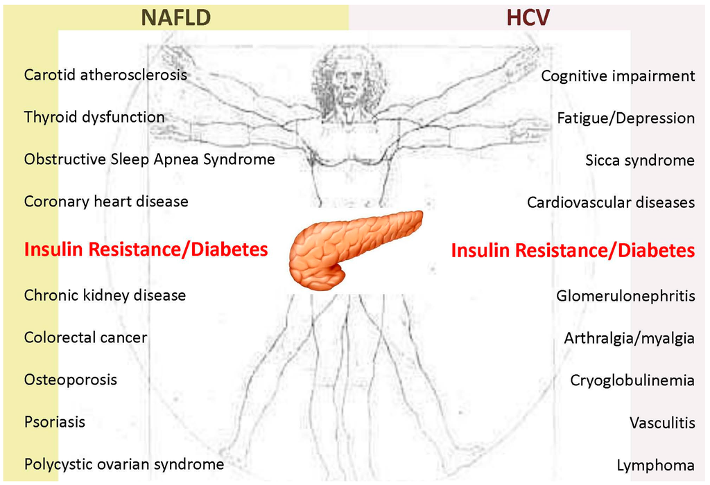 Consistent with the development of new-onset T2D observed in the setting of NAFLD, HCV promotes a state of IR that leads, over time, to pancreatic beta-cell dysfunction, eventually culminating in the irreversible damage of such cells and the development of overt T2D [].