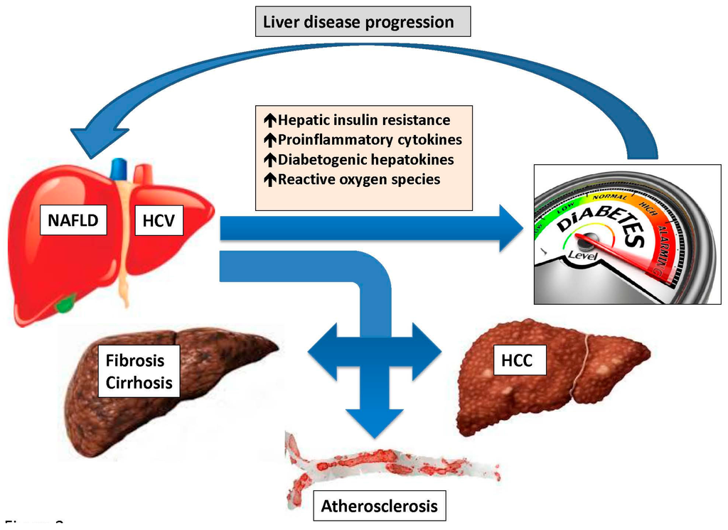 Non-alcoholic fatty liver disease, hepatitis C virus infection and type 2 diabetes: the “vicious circle”. The liver plays a pathogenic role in the development of type 2 diabetes both in the context of non-alcoholic fatty liver disease and hepatitis C virus infection through the development of systemic and hepatic insulin resistance, partly mediated by the release of multiple pro-inflammatory cytokines, diabetogenic hepatokines and reactive oxygen species. If left uncorrected, insulin resistance will eventually lead to progressive pancreatic beta cell failure in predisposed individuals. Moreover, the strong interconnection between type 2 diabetes and liver disease may result into a “vicious circle” [] eventually leading to liver disease progression with an excess risk of liver-related, i.e., cirrhosis and hepatocellular carcinoma (HCC), and cardiovascular complications, i.e., atherosclerosis.