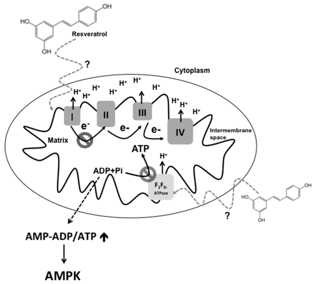 The polyphenol resveratrol (3,4′,5-trihydroxy-trans-stilbene, RSV) is a phytochemical found in over 70 species of plants, including plants of economic importance such as grape (Vitis vinifera), cranberry (Vaccinium macrocarpon), and peanut (Arachis hypogaea). Exposure of these plants to biotic and abiotic stresses induces RSV synthesis. Nonetheless, RSV production is mainly associated with plant-pathogenic attacks [1,2,3]. In this regard, RSV biological significance in plants has been linked to the decrease of fungal cell viability to counteract pathogenic cellular proliferation [4,5]. However, the exact mechanism by which RSV disturbs cell viability is still unclear. The inhibition of the electron transport chain (ETC) and the F0F1-ATPase is one of the promising hypothetical-mechanisms of RSV action [6,7]. This idea could explain the proliferation inhibition of undesirable pathogenic organisms by lessening its cellular energy production and the health benefits exerted in mammalian systems including its antioxidant properties. However, evidence supporting this concept is still insufficient. The mechanism underlying toxic and beneficial effects of RSV has not been fully elucidated. Therefore, some authors propose that RSV could activate diverse proteins involved in different signaling pathways [8,9] indicating the diverse nature of this molecule. On the other hand, other studies reveal that adenosine monophosphate (AMP) protein kinase (AMPK) is the main target of RSV, supporting the hypothesis of a single signaling pathway with a pleiotropic effect [6,10,11]. Nonetheless, how RSV activates AMPK remains unclear and this could be the key to understanding RSV mechanism. It is reasonable that increase of AMP levels by RSV-mediated inhibition of cellular respiration promotes AMPK activation, although this idea was not fully confirmed [6]. In this review, evidence is discussed that supports the putative AMPK signaling pathway activated by RSV due to the inhibition of cellular respiration and its relationship with amelioration of some molecular processes related to metabolic disorders including chronic-degenerative diseases (CDD).