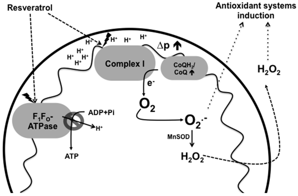 Pro-oxidant effects of resveratrol and its relation with the induction of antioxidant systems. The inhibition of complex I and/or F1F0-ATPase by RSV causes disengagement of the ETC with an increase in mitochondrial membrane potential (∆p) and production of O2− and H2O2, as well as a decrease in ATP production and breathing. Increased ROS production could subsequently induce the antioxidant response as a defense mechanism.