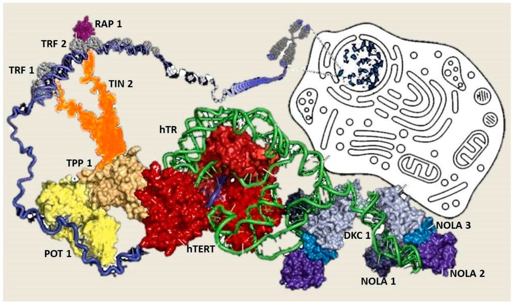 Model representing the telomeres associated proteins. Telomerase (including hTERT (red) and hTERC (green)) represents the principal catalytic subunit. The Shelterin complex is anchored by binding of the proteins TRF1 and TRF2 to double-stranded telomeric repeats. TRF1 and TRF2 are bridged to the single-stranded telomeric-repeat G-strand DNA-binding protein POT1 through TIN2 and TPP1. Additionally, shelterin RAP1 binds directly to TRF2. Dyskerin complex involving NOLA proteins, interacts and stabilizes the non-overlapping regions of hTERC.