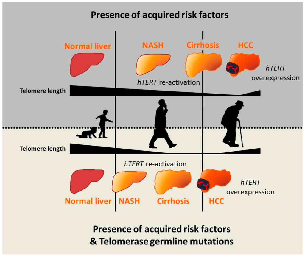 Hypothesis for telomeres’ role in pathogenesis of nonalcoholic fatty liver disease (NAFLD) progression toward cirrhosis and hepatocellular carcinoma (HCC). The model shows that, in the presence of triggering acquired risk factors such as obesity and insulin resistance, the liver undergoes cycle of damage and regeneration that requires telomerase re-activation. However, degenerative chronic conditions lead to telomere shortening and fibrosis progression towards cirrhosis, the main risk factor for HCC. In carriers of telomerase germline loss-of-function mutations, this process is accelerated due to telomerase inability to elongate telomeres, thus impairing tissue regeneration. Moreover, telomerase mutations may have a direct pro-carcinogenic effect by inducing genomic instability. Finally, telomere re-elongation in cancer tissue was triggered by different mechanisms, among which, overexpression of hTERT is necessary for the immortalization of the neoplastic clone.