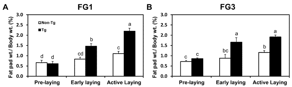 Differences in means for average eggs produced per week and age of first egg were analyzed by Student’s t-test with p < 0.05 declared significant. Descriptive statistics for interclavicular fat pad percentage of body weight, adipocyte sizes, and NEFA concentrations were calculated using the MEANS procedure of SAS (SAS Institute, Cary, NC, USA). Differences between means for non-transgenic and transgenic birds and among laying stages was assessed using a general linear model. Significant differences were detected at a level of 5% by probability difference (PDIFF). Results are presented as least square means with standard errors of the means.