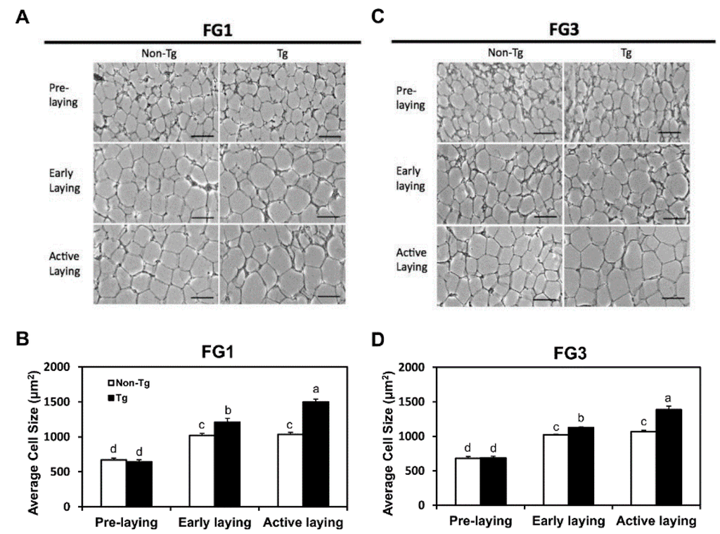 All procedures, including dehydration, embedding, sectioning, and staining with hematoxylin and eosin, for the fixed adipose samples from non-transgenic and transgenic FG1 and FG3 quail were conducted in accordance with our previous report []. Images were captured with an AXIO-Vert.A1 optical microscope (Carl Zeiss Microscopy, Thornwood, NY, USA) furnished with an AxioCam MRc5 camera (Carl Zeiss Microscopy). All images were analyzed with ImageJ software (NIH ImageJ 1.47, http://imagej.nih.gov/ij) to determine average cell size. Average adipocyte size was calculated by taking the area of a large portion of cells and dividing this by the total number of cells found within the area. At least 1000 cells were analyzed per animal.