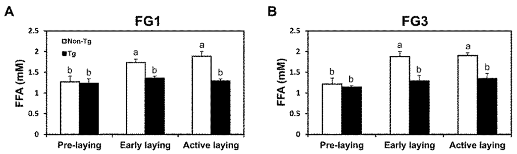 No differences in NEFA concentrations in the blood serum (p > 0.05) were evident between non-transgenic and transgenic quail from FG1 and FG3 at pre-laying. Transgenic quail from FG1 had 22% (p < 0.05) lower NEFA concentrations at early laying and 32% (p < 0.05) lower NEFA concentrations in the blood at active laying (Figure 3A). Transgenic quail from FG3 had 31% (p < 0.05) lower NEFA concentrations at early laying and 29% (p < 0.01) lower NEFA concentrations at active laying (Figure 3B). In non-transgenic quail, NEFA concentrations increased after laying, while transgenic quail did not demonstrate this elevation from pre-laying to early or active laying due to overexpression of G0S2 blocking lipid mobilization.
