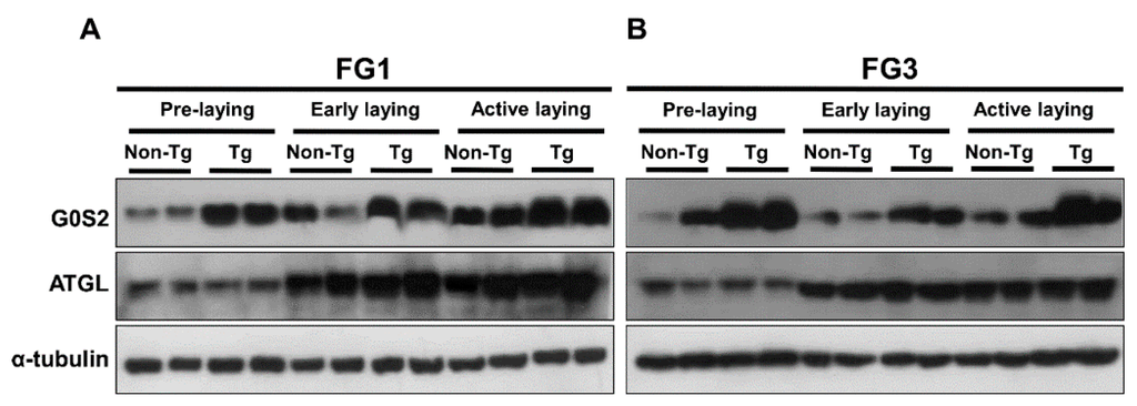 Protein expression of G0S2 and ATGL is altered in transgenic quail. Expression of G0S2 and ATGL in adipose tissue of (A) line FG1 and (B) line FG3 with α-tubulin as a reference. Two non-transgenic and two transgenic quail from each stage of laying were randomly selected to demonstrate the different expression patterns of G0S2 and ATGL between the groups and across laying stages.