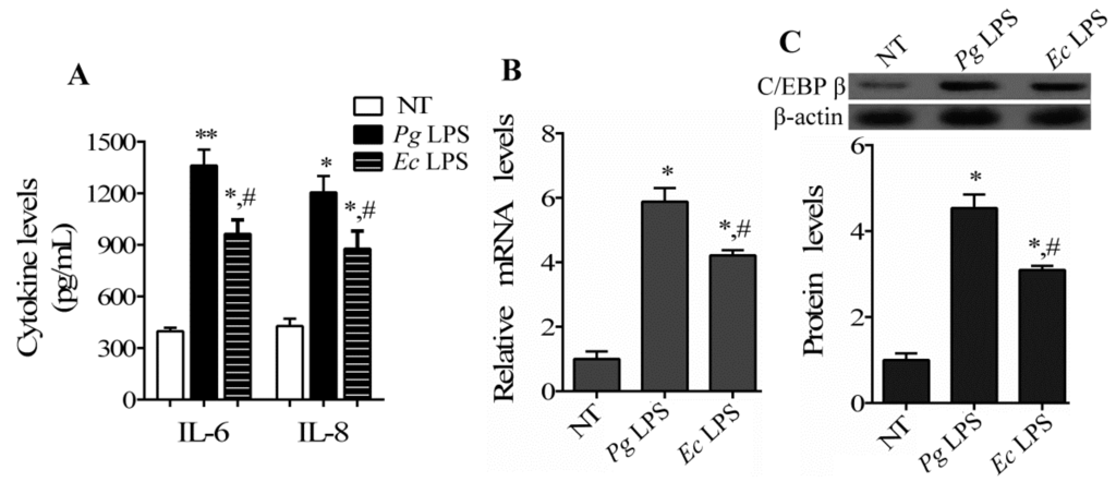 Expression of CCAAT/enhancer-binding protein β (C/EBP β) gene in human periodontal ligament cells (hPDLCs) stimulated by lipopolysaccharide (LPS). (A) hPDLCs were incubated with 1 μg/mL Porphyromonas gingivalis (P. gingivalis) LPS (Pg LPS) or E. coli LPS (Ec LPS) for 24 h. The levels of IL-6 and IL-8 in hPDLCs were measured using an ELISA kit; then, the mRNA (B) and protein (C) levels of C/EBP β in hPDLCs were analyzed by RT-PCR and Western blotting, respectively (* p < 0.05, ** p < 0.05 vs. not treated (NT); # p < 0.05 vs. Pg LPS).