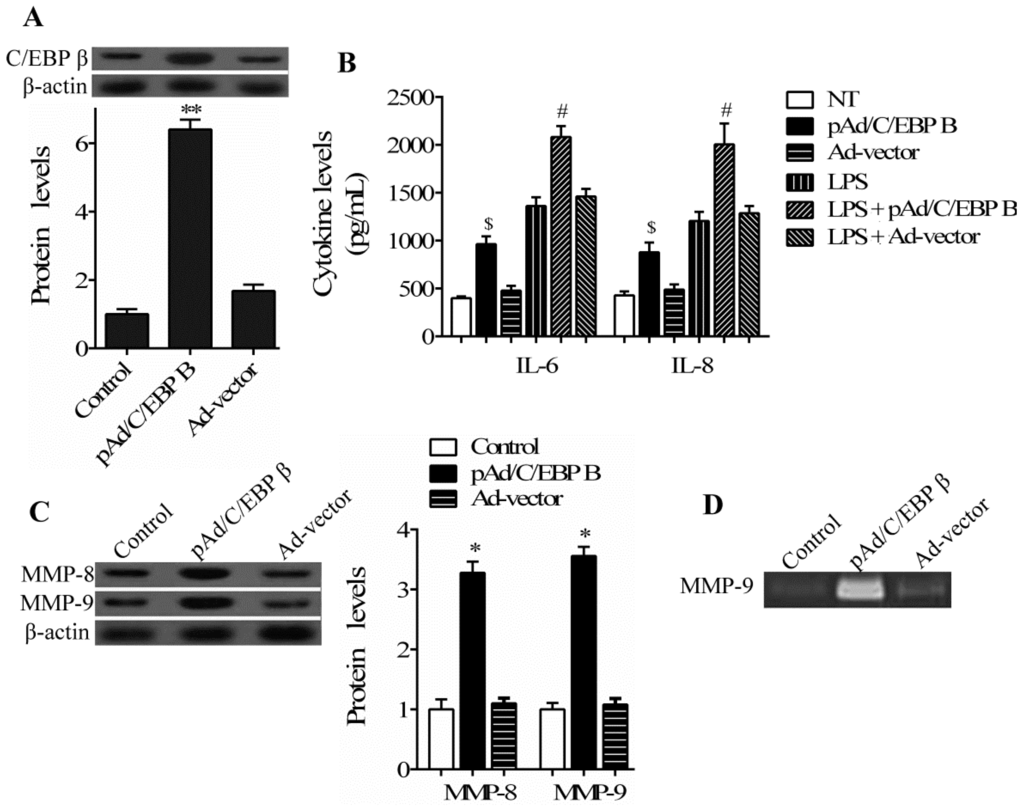 Furthermore, we investigated the expression level of MMP-8 and MMP-9 in hPDLCs treated with pAd/C/EBP β and LPS by Western blotting assay. The results shown in Figure 2C indicate that MMP-8 and MMP-9 expression were detected in hPDLCs stimulated by LPS. Following pAd/C/EBP β transduction, the levels of MMP-8 and MMP-9 in hPDLCs were significantly increased. We then performed gelatin zymography assay to determine the effect of C/EBP β on MMP-9 activity. Compared to the control, the secretion of MMP-9 was significantly increased by C/EBP β overexpression (Figure 2D). Consistent with the results in Figure 2B, we also observed that C/EBP β overexpression increased the expression of MMP-8 and MMP-9 around 1.5-fold in unstimulated hPDLCs (data not shown), suggesting the regulatory role of transcription factors C/EBP β in hPDLCs in response to LPS stimuli.
