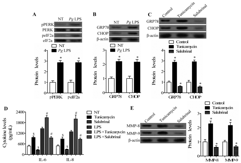 The role of ER stress induced by LPS in hPDLCs. hPDLCs were incubated with 1 μg/mL P. gingivalis LPS for 24 h. (A) The phosphorylation of protein kinase-like ER kinase (PERK), eIF2α and (B) the expression of GRP78/Bip and C/EBP homologous protein (CHOP) in hPDLCs were measured by Western blotting (* p < 0.05 vs. NT); (C) hPDLCs were pretreated with 5 μg/mL tunicamycin or 10 μM salubrinal for 2 h, followed by stimulation with P. gingivalis LPS for 24 h. The levels of GRP78/Bip and CHOP in hPDLCs were measured by Western blotting to confirm the efficiency of salubrinal and tunicamycin; (D) the levels of IL-6 and IL-8 were analyzed by ELISA in hPDLCs treated with salubrinal or tunicamycin in the presence or absence of LPS; and (E) Western blotting was used to measure the expression of MMP-8 and MMP-9 in hPDLCs stimulated with LPS. Untreated hPDLCs were stimulated by P. gingivalis LPS and used as the control. ($ p < 0.05 vs. NT; # p < 0.05 vs. LPS; * p < 0.05 vs. control).