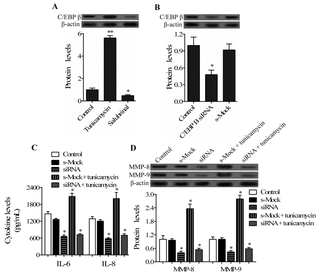 Interplay between C/EBP β and endoplasmic reticulum (ER) stress in hPDLCs. (A) hPDLCs were pretreated with 5 μg/mL tunicamycin or 10 μM salubrinal for 2 h, followed by stimulation with P. gingivalis LPS for 24 h. The expression of C/EBP β in hPDLCs was then analyzed by Western blotting; (B) hPDLCs were transfected with C/EBP β siRNA or non-targeting control siRNA (s-Mock) for 48 h, followed by stimulation with P. gingivalis LPS for another 24 h. The protein level of C/EBP β was determined by Western blotting to confirm the efficiency of siRNA; (C,D) C/EBP β siRNA-transfected hPDLCs were pretreated with tunicamycin, followed by stimulation with P. gingivalis LPS. The levels of IL-6 and IL-8 and the expression of MMP-8 and MMP-9 in hPDLCs were then analyzed by ELISA and Western blotting, respectively. Untransfected hPDLCs treated with LPS were used as the control. (* p < 0.05, ** p < 0.05 vs. control).