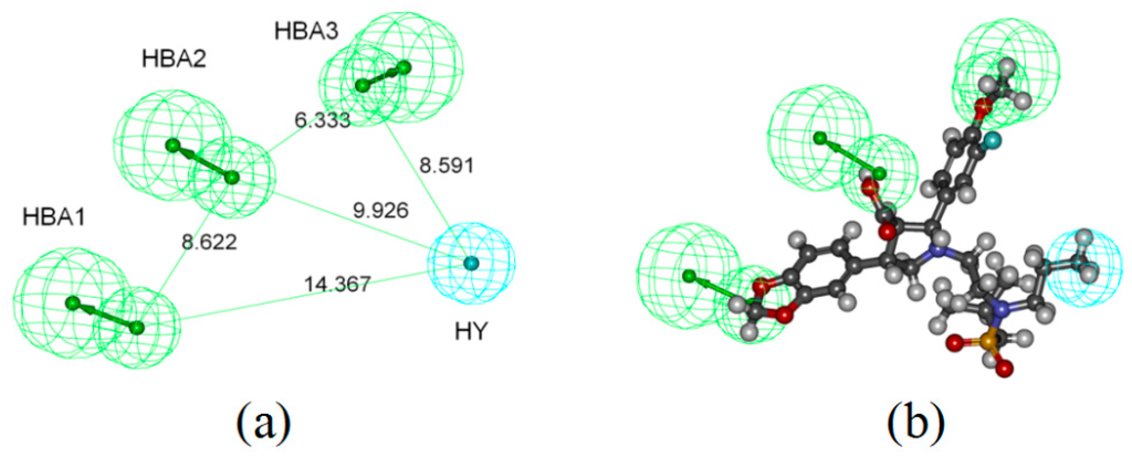 Pharmacophore model of dual ETA/ETB receptor antagonists (a) and its overlay on CHEMBL323055 (b). The numbers represent the distance between each two pharmacophore features. The arrows represent the direction of hydrogen bond groups. Gray, white, red, blue and yellow spheres represents carbon, hydrogen, oxygen, nitrogen and sulfur atoms, respectively.