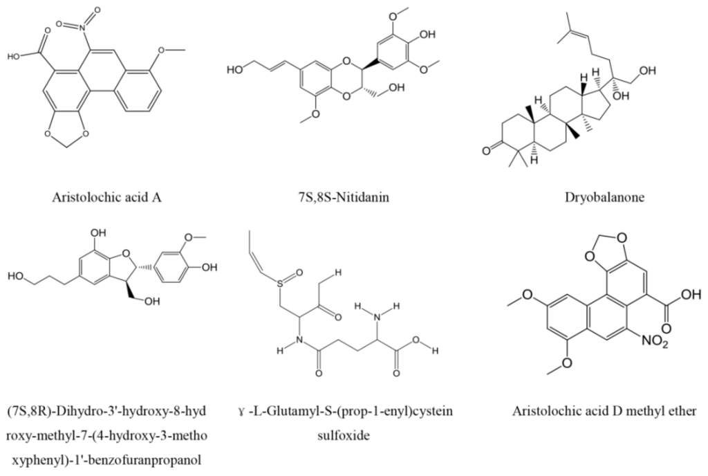 Comparing the ligand- and docking-based virtual screening, six compounds (Figure 2) from GXSHP could both fit to the pharmacophore model well and provide reasonable docking results. They were aristolochic acid A, 7S,8S-Nitidanin, Dryobalanone, (7S,8R)-Dihydro-3′-hydroxy-8-hydroxy-methyl-7-(4-hydroxy-3-methoxyphenyl)-1′-benzofuranpropanol, γ-l-Glutamyl-S-(prop-1-enyl)cystein sulfoxide and aristolochic acid D methyl ether. Aristolochic acid A is a common compound that contained in many natural herbals, such as Aristolochia contorta, Aristolochia manshuriensis, Aristolochia fangchi, Aristolochia heterophylla, etc. Previous studies have demonstrated that aristolochic acid A has the pharmacological effect of protecting against infections and inflammation, inhibiting the growth of bacteria [32,33], blocking H2O2-induced platelet aggregation, suppressing hydroxyl radical induced platelet activation through the arachidonic acid pathway [34,35], and increasing the levels of NO/cyclic guanosine monophosphate (GMP) and cyclic GMP-induced vasodilator-stimulated phosphoprotein phosphorylation [36]. The six compounds were purchased from National Institutes for Food and Drug Control for further in vitro assays. The purity of all compounds was over 98% on the basis of HPLC analysis.