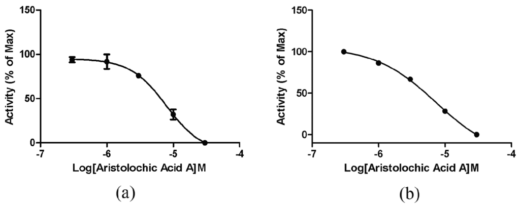 Dose-response curves for aristolochic acid A using calcium influx assay in HEK293/ETAR cells (a) and HEK293/ETBR cells (b). All error bars indicate SE of the three replicates.