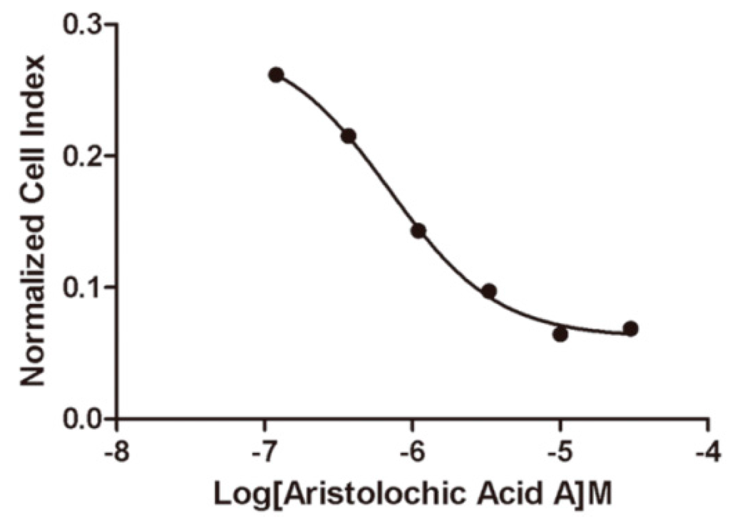Dose-response curve for aristolochic acid A using impedance-based assay in Hela cells.