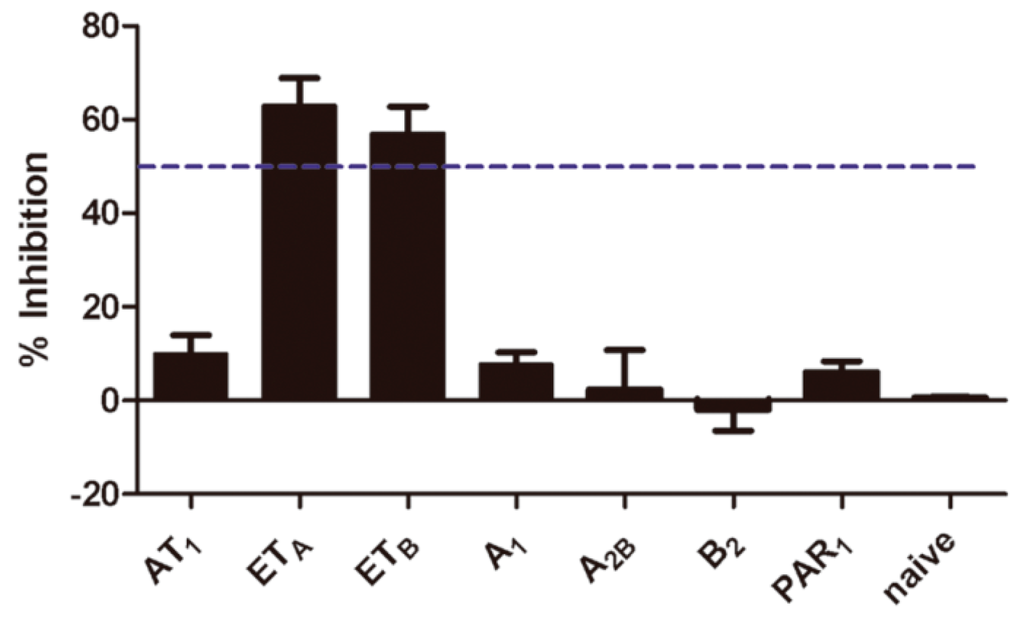 The selectivity of aristolochic acid A was further assessed by the calcium influx assay against 7 GPCRs, i.e., angiotensin II type 1 receptor (AT1), ETA/ETB receptors, adenosine A1/A2B receptor, B2 bradykinin receptor (B2) and proteinase-activated receptor 1 (PAR1). Initial screening was conducted at the final concentration of 10 μM. The screen results showed that aristolochic acid A was only active at ETA and ETB receptors in the screening panel, so it was proven to be a selective dual ETA/ETB receptor antagonist (Figure 5).