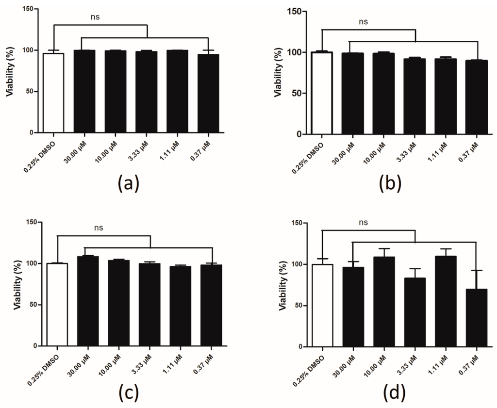 The selectivity of active compounds were further assessed, in which the compound was tested for inhibiting seven GPCRs, i.e., angiotensin II type 1 receptor (AT1), ETA/ETB receptors, adenosine A1/A2B receptor, B2 bradykinin receptor (B2) and proteinase-activated receptor 1 (PAR1). HEK293 cells that are stably expressing those GPCRs were separately plated in a 96-well clear-bottom black plate with a density of 40,000 cells per well. The plate was coated with matrigel and incubated at 37 °C overnight. Screens were conducted at a concentration of 10 μM using calcium assay when cells challenged with their selective agonists for antagonist assay. HEK293 cell line was set up as naive group and cells were challenged with 10 μM ATP (purity ≥ 99%, Sigma-Aldrich) as agonist.