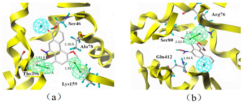 Accurate prediction of ligand-protein binding mode can not only shed light on the mechanism of the molecular recognition but also promote drug optimization. The binding mode of aristolochic acid A with ETAR and ETBR was predicted (Figure 7). The docking results implied that Ser46, Ala78, Lys159 and Thr396 of ETAR and Arg76, Ser80 and Gln412 of ETBR are the key amino acid residues binding to aristolochic acid A.