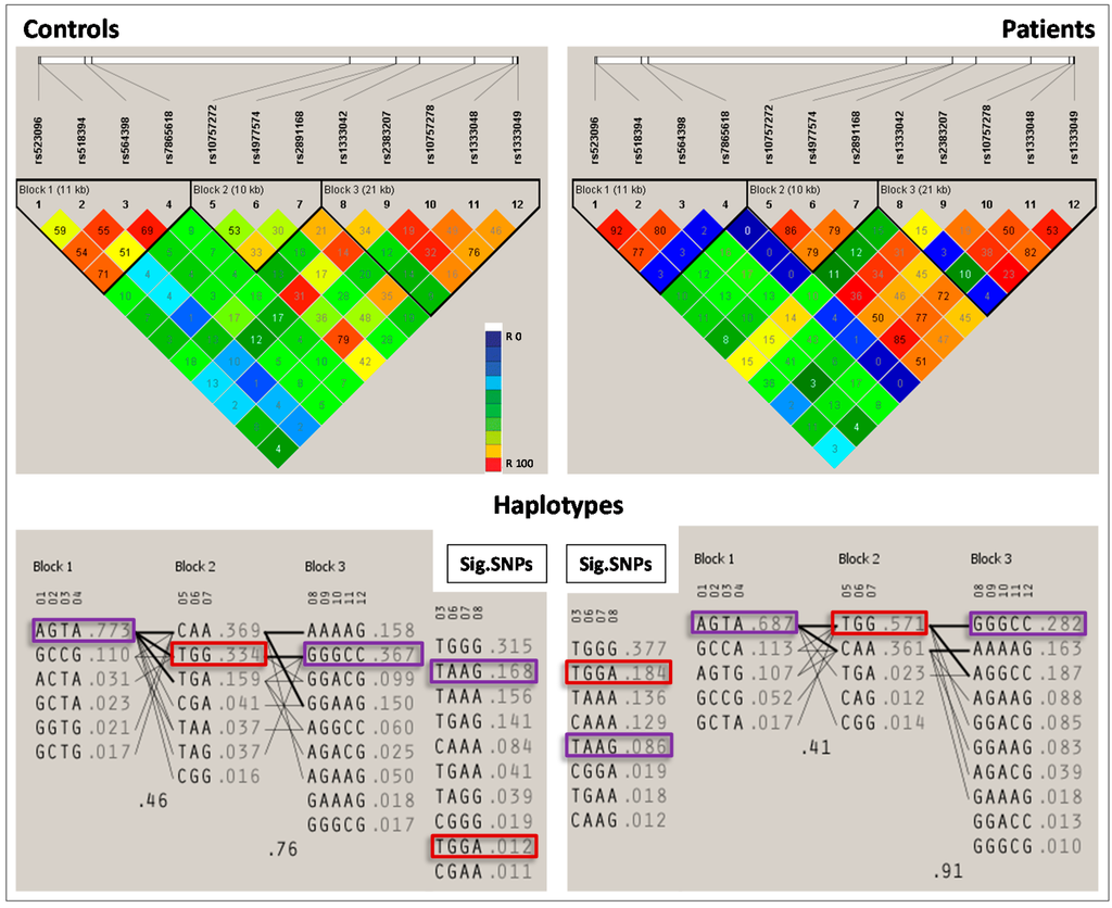 | Block | Haplotype | Frequency | Case, Control Frequency | Chi Square | p Value |