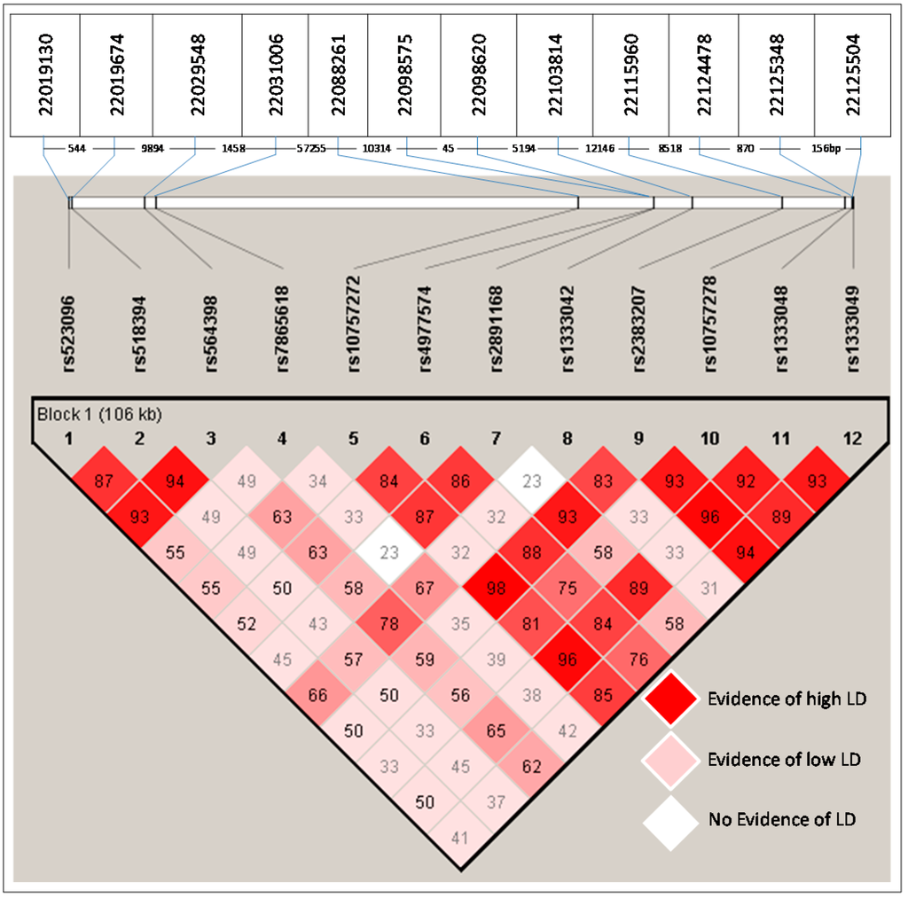 - Huang, Y.; Ye, H.; Hong, Q.; Xu, X.; Jiang, D.; Xu, L.; Dai, D.; Sun, J.; Gao, X.; Duan, S. Association of CDKN2BAS polymorphism rs4977574 with coronary heart disease: A case-control study and a meta-analysis. Int. J. Mol. Sci. 2014, 15, 17478–17492. [Google Scholar] [CrossRef] [PubMed]