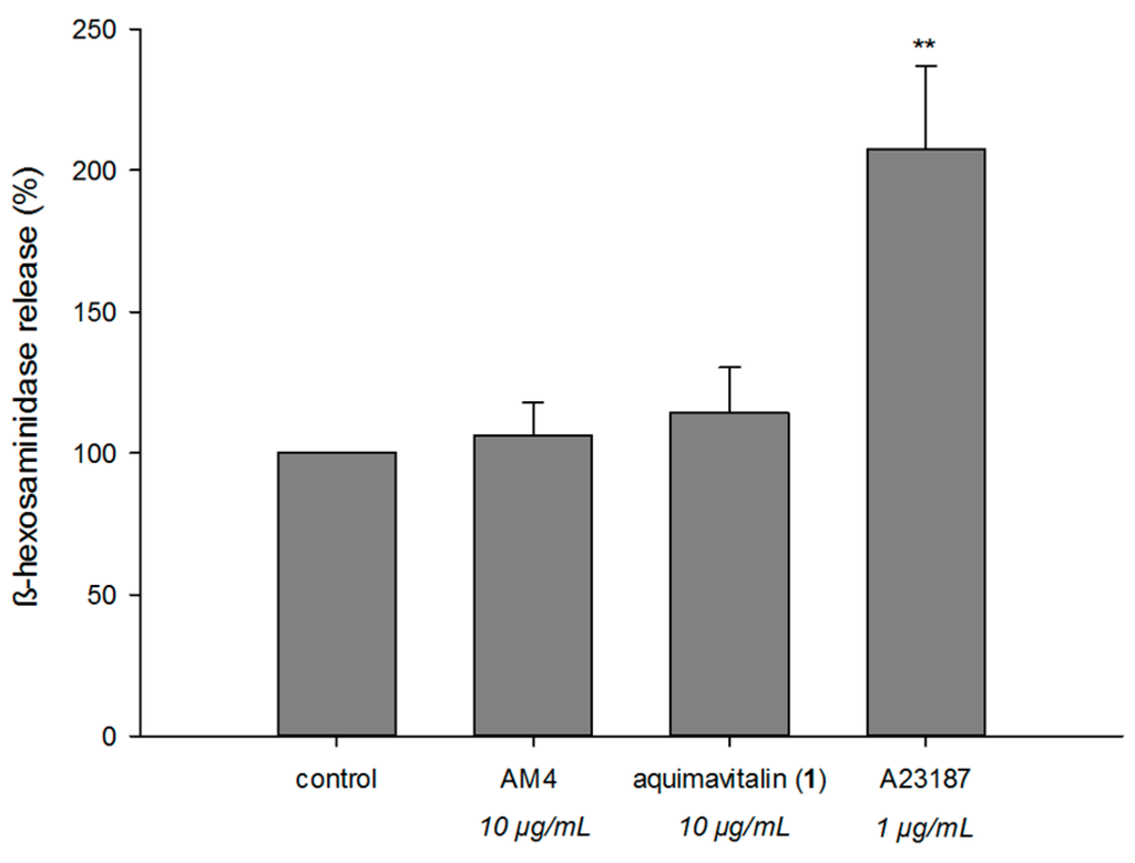 Activity of phorbol ester-rich fraction (AM4) and aquimavitalin (1) on stimulant-free degranulation in RBL-2H3 cells. The RBL-2H3 cells were treated with AM4 (10 µg/mL) and aquimavitalin (10 µg/mL) for 10 h. Tyrode’s buffer supplemented with glucose, bovine serum albumin (BSA) and glutamine was used as a medium. A23187 (1 µM) was used as a positive control. Data are expressed as mean ± SD (n = 3). ** p < 0.001 compared with the control value.
