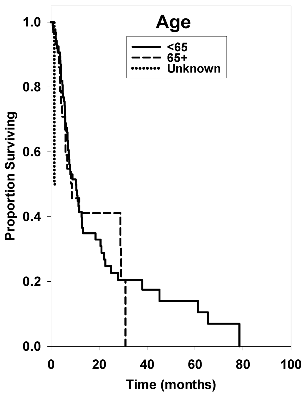 Overall survival (OS) curves of patients with ages <65, 65+, or unknown at time of brain metastasis diagnosis.