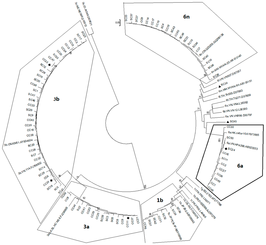 Phylogenetic distribution of HCV genotypes and subtypes of the Honghe patients based on comparison of the C/E1 gene region. The phylogenetic tree was generated based on comparison of the C/E1 gene region between all of the Honghe sequences and some of the representative HCV genotypic references. The sequence of C/E1 corresponds to nucleotides of 869–1, i.e., 292 in the HCV H77 genome (NC_004102). Only three HCV genotypes 1, 3, and 6 were detected as indicated. The number at each node represents the percentage of bootstrap support for 1000 replicates. Only the values of over 70% are shown here. The scale bar represents 0.05 nucleotide or amino acid substitutions per site. Sample of the SC45 (marked with ●) was assigned to subtype 6v with high bootstrap value and high nucleotide similarity. The SC34 (marked with ▲) formed two diverse clusters with low bootstrap values and low nucleotides similarities, which suggests that the subtype assignment of this sample was not clear. All of the assignments of HCV genotypes and subtypes are consistent with the results shown in Figure 1 with the exception of the SC34 and the SC45. The samples of SC18, CC5, CC15 and CC26 denoted with ♦ were assigned based only on the information of the C/E1 gene region because sequence information of the NS5B region was not available due to failures of either PCR or sequencing results.
