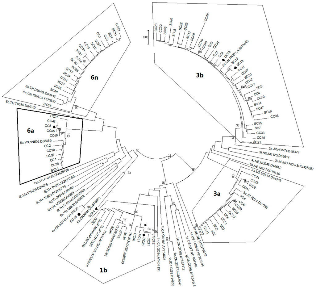 Phylogenetic distribution of Hepatitis C virus (HCV) genotypes and subtypes of the Honghe patients based on comparison of the NS5B gene region. The phylogenetic tree was generated based on comparison of the NS5B gene region between all of the Honghe sequences and some of the representative HCV genotypic references. The sequence of NS5B corresponds to nucleotides of 8276–8615 in the HCV H77 genome (NC_004102). Only three HCV genotypes 1, 3, and 6 were detected as indicated. The number at each node represents the percentage of bootstrap support for 1000 replicates. Only the values of over 70% are shown here. The scale bar represents 0.05 nucleotide or amino acid substitutions per site. SC, single HCV infection; CC, HCV/HIV co-infections. Samples of the SC34 and the SC45 (marked with ▲) formed two diverse clusters with low bootstrap value and low nucleotides similarity, which suggests the subtype assignments of these samples were not clear. All of the assignments of HCV genotypes and subtypes are consistent with the results shown in Figure 2 with the exception of SC34 and SC45. The samples of SC24, CC11, CC22 and CC24 denoted with ♦ were assigned based only on the information of the nonstructural protein 5B (NS5B) gene region because sequence information of the core/envelope 1 (C/E1) and region was not available due to failures of either PCR or sequencing results.