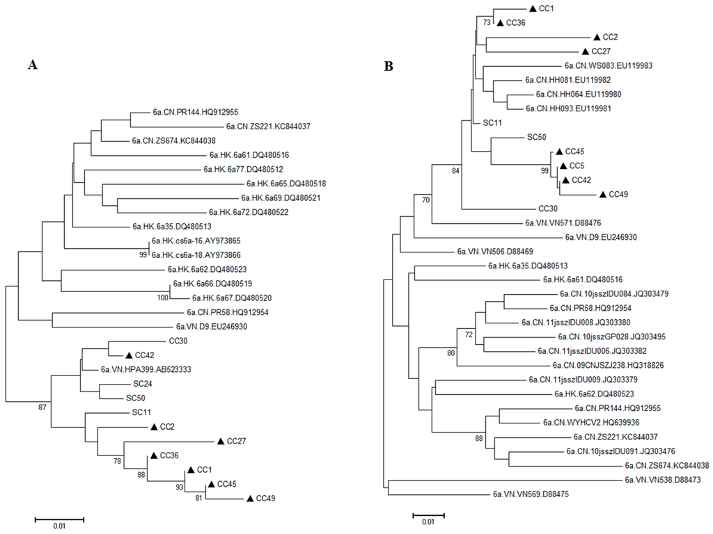Phylogenetic analysis of HCV genotype 6a. The phylogenetic tree was generated for HCV-6a only. The genetic relationship between the HCV-6a sequences isolated from Honghe and the representative reference sequences of HCV-6a was compared based on the genomic regions of NS5B (A) and C/E1 (B). All of the references sequences were deposited in the pathogen database of the Los Alamos National Laboratory. The number at each node represents the percentage of bootstrap support for 1000 replicates. The scale bar represents 0.01 nucleotide or amino acid substitutions per site. The bars at the base of the trees indicate the genetic divergence. The two upper case letters added to each of the reference sequences indicate the country origin. CN, China; HK, Hong Kong; VN, Vietnam; SC, single HCV infection; CC, HCV/HIV co-infections; ▲, IDUs.