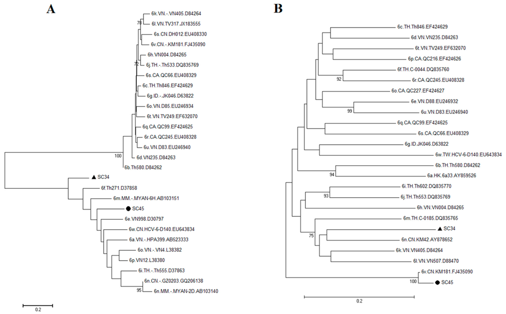 Besides the HCV-6a genotype described above, two HCV isolates (SC34 and SC45) fell into different HCV-6 genotypes based on the phylogenetic analyses (Figure 4A,B). Alignment of the C/E1 region of the SC45 sequence showed a close link to HCV-6v.CN.KM 181.FJ435090 with 100% bootstrap value and 95% nucleotide similarity (Figure 4B, marked with ●). The sequence of HCV-6v.CN.KM 181.FJ435090 was from a nearby city of Kunming, Yunnan Province. However, alignment of the NS5B region of the SC45 sequence loosely clustered with the Vietnam or Myanmar sequences (Figure 4A, marked with ●), suggesting SC45 could potentially be a new and recombinant variant of HCV-6.