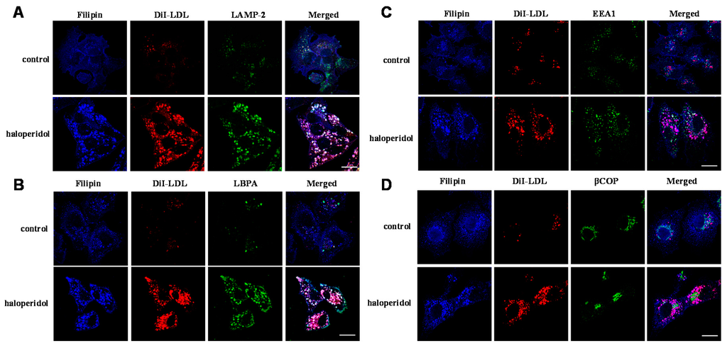 Furthermore, treatment with haloperidol did not alter the distribution of EEA1, a marker of early endosomes (Figure 1C). Indeed, in haloperidol-treated treated cells, organelles heavily loaded with DiI were not stained for EEA1. This indicates that LDL-derived lipids accumulated in late endosomes/lysosomes and that traffic through the early endosomal compartment was not affected by the antipsychotic. Finally, haloperidol did not perturb the Golgi apparatus (Figure 1D), since it did not change the distribution of the specific marker β-COP.