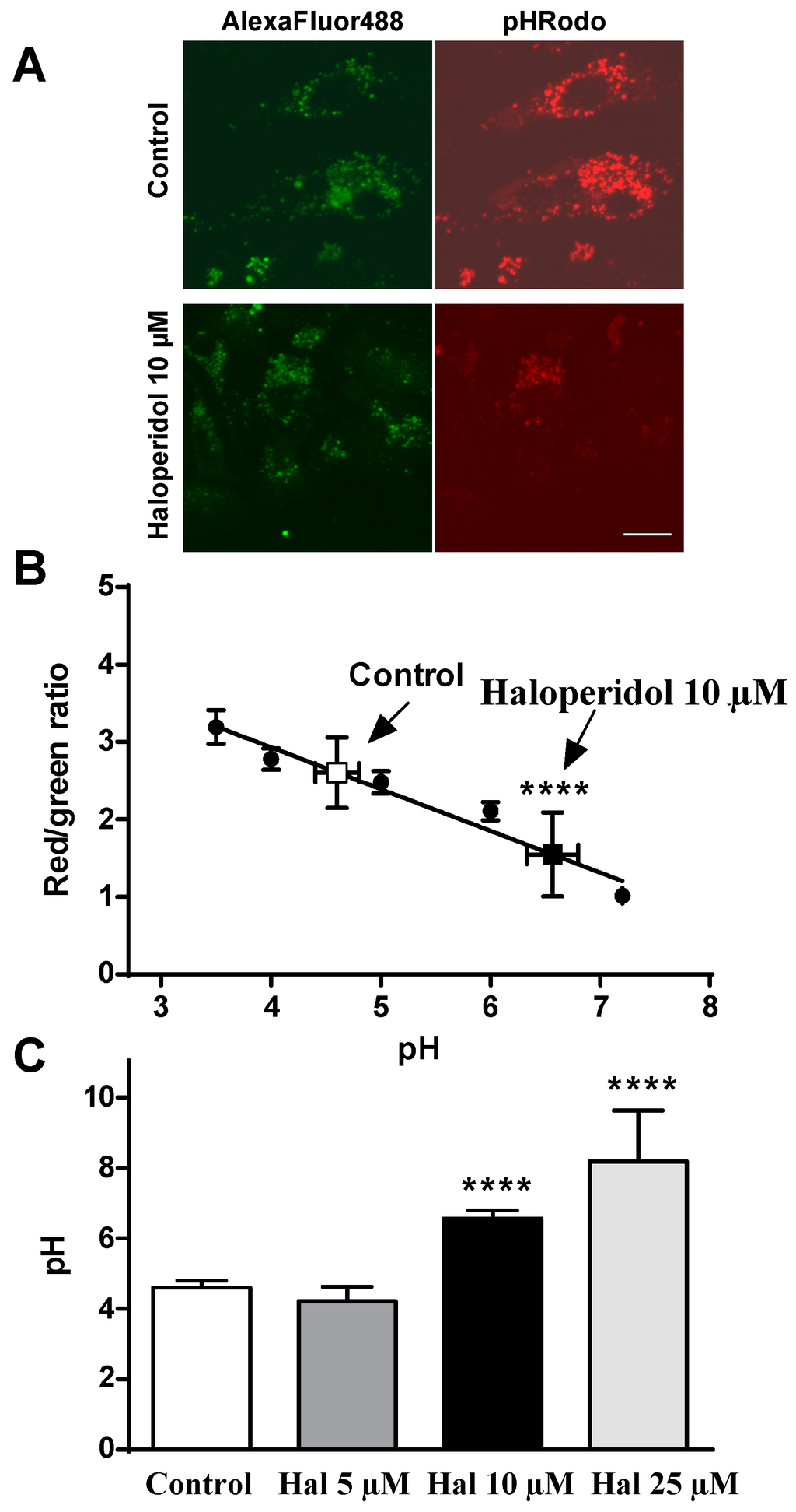 FGA haloperidol increases the lysosomal pH. HepG2 cells were incubated with LDL. (30 µg/mL of cholesterol) for 12 h in the absence (control) or the presence of haloperidol (Hal) (5, 10 or 25 µM) and pH-sensing fluorochromes Alexa Fluor 488-dextran and pHrodo-dextran. (A) Sample confocal images of control and 10 µM haloperidol treated culture dishes showing emission reduction of pH sensitive pHrodo (in red) relative to pH insensitive Alexa Fluor probe (in green). Scale bar, 5 µm. (B) Standard curve to calculate endogenous lysosomal pH where values of the red:green fluorescence ratio corresponding to control and haloperidol at 10 µM are indicated. (C) Effect of increasing concentrations of haloperidol on lysosomal pH. Results are mean ± SEM (n = 3–15). Statistical comparisons shown are haloperidol versus control (**** p <0.0001).