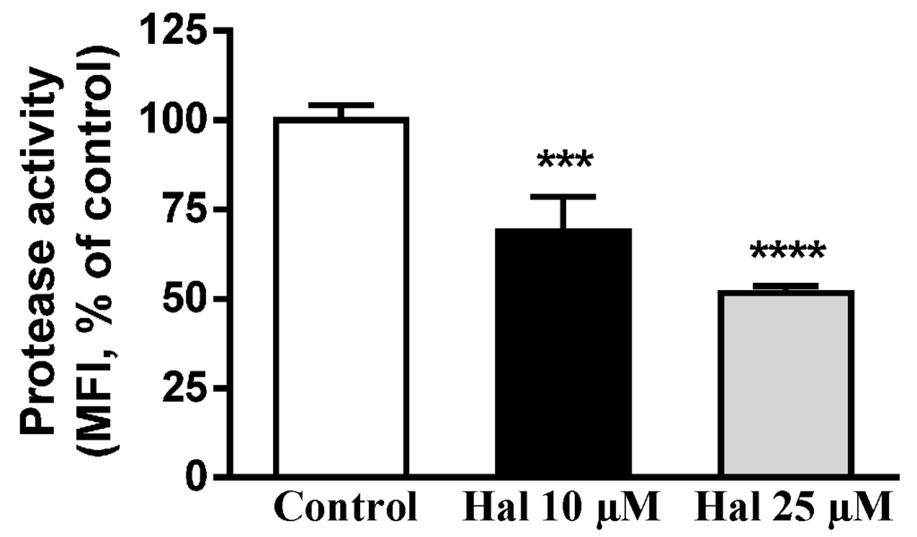 The above-mentioned mentioned results encouraged us to study whether treatment with haloperidol affected the lysosomal protease activities. To perform this study we used DQ™ BSA (DQ-BSA), a BODIPY® FL-labeled albumin derivative that initially does not fluoresce. After binding to the Fc receptor, the complex is internalized and after hydrolysis of the protein emits fluorescence [24]. For this study we used THP-1 cells differentiated to macrophages, because HepG2 cells do not express Fc receptors. THP-1 macrophages maintained in lipoprotein-deficient serum (LPDS) medium with LDL were kept untreated (control) or treated with haloperidol (10 and 25 µM), then the cells were exposed to DQ-BSA and finally cells were analyzed by a FACScan-Flow cytometry system. As shown in Figure 3, treatment with haloperidol dose-dependently decreased the appearance of DQ-BSA-fluorescence, indicating that lysosomal protease activity was reduced.