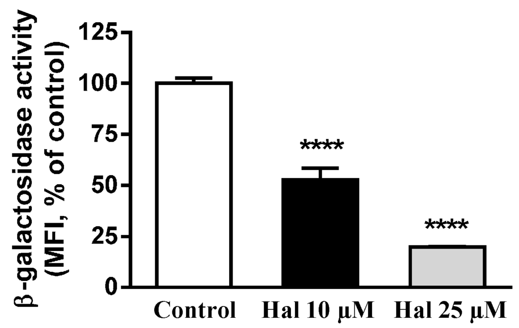 To measure β-galactosidase activity by flow cytometry, we used the fluorogenic substrate C12FDG (5-dodecanoylaminofluorescein di-β-d-galactopyranoside, Life Technologies Corporation). This compound is a membrane-permeating, non-fluorescent substrate of β-galactosidase, which, after hydrolysis of the galactosyl residues, emits green fluorescence and remains confined within the cell. For the assay, cells maintained in LPDS medium with LDL were treated or not with haloperidol for 2 h before C12FDG (33 µM) was added, and then they were incubated for an additional 4 h. At the end of the incubation, cells were analyzed by a FACScan-Flow cytometry system (BD Biosciences). Light scatter parameters were used to exclude dead cells and subcellular debris from the analysis. The C12-fluorescein signal was measured on the FL1 detector and β-galactosidase activity was estimated using the MFI of the cell population.