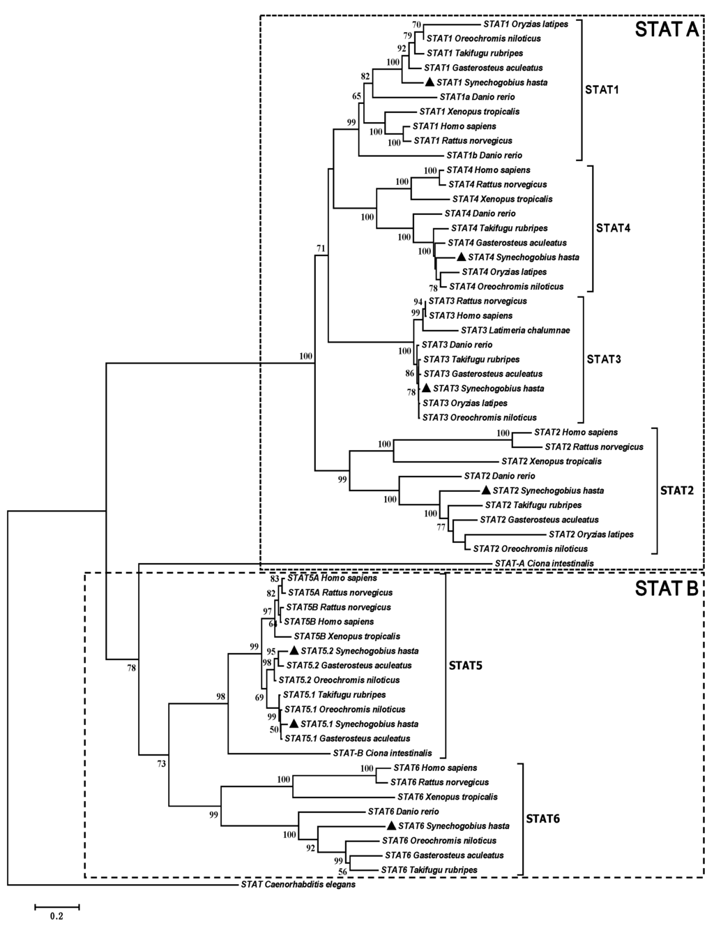Neighbour-joining phylogenetic tree based on the protein sequences of signal transducers and activators of transcription proteins (STATs) from S. hasta (▲) and other species. Branch support values represent a percentage of 1000 bootstrap replicates and values lower than 50 were absent in the present analysis. Protein accession numbers are listed in Supplementary Table S1.