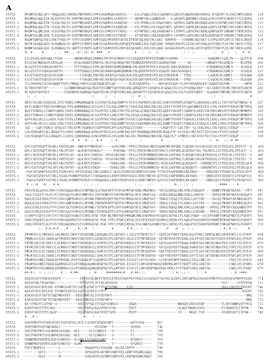 The complete cDNA of the S. hasta STAT genes were compiled by overlapping the sequences of the cloned cDNA and the 5′-rapid amplication of cDNA ends (RACE) and 3′-RACE polymerase chain reaction (PCR) products. The STAT family consists of seven members: STAT1, STAT2, STAT3, STAT4, STAT5.1, STAT5.2 and STAT6. The full-length cDNA of STATs ranged from 2804 to 3722 bp, with ORFs of 2229–2484 bp encoding 742–827 residues (Table 1). Alternative splicing of STAT1 resulted in the generation of two isoforms, named STAT1-1 and STAT1-2. STAT3 transcript could be alternatively spliced to generate STAT3-2, which lacked the 20 amino acids in TAD compared with STAT3-1.