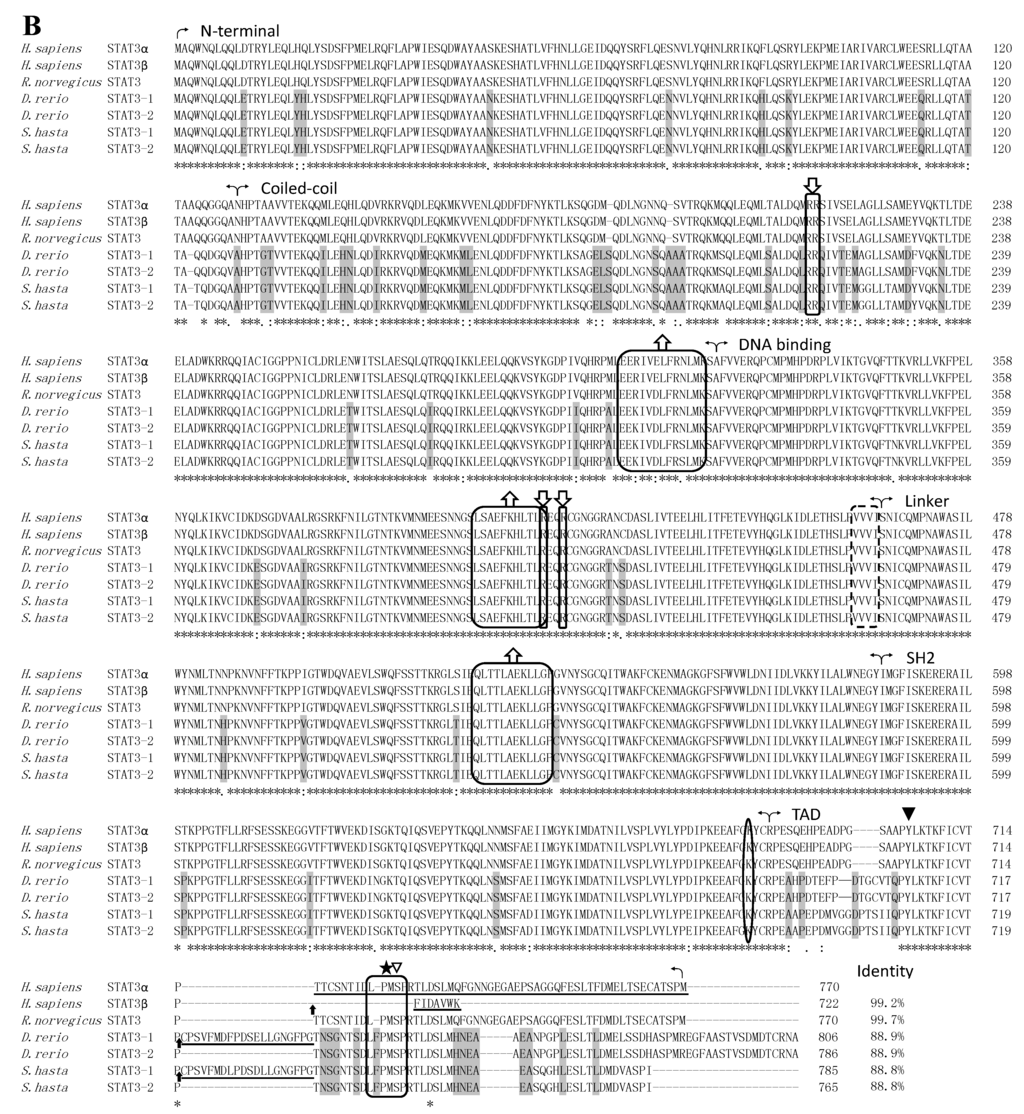 Multiple sequence alignment of STATs. The accession numbers from Ensemble databases are given in Supplementary Table S1. Numbers on the right indicate the amino acid positions. Identical (*), high similar (:) and low similar (.) residues were indicated below the alignment. Hyphens represent spaces inserted to maximize similarity. (A) Alignment of the deduced amino acid sequences of STATs from S. hasta. Spliced sites are indicated by upward arrowheads. Conserved phosphorylation sites in all STAT members are shaded by a dark background. Different amino acids generated by alternative splicing are indicated by an underline; (B) Alignment of STAT3 amino acid sequences from S. hasta, D. rerio, H. sapiens and R. norvegicus. Curved arrowheads represent the boundaries of different domains. Upward arrowheads represent spliced sites. Different amino acids generated by alternative splicing are indicated by an underline. A solid triangle represents a single phosphotyrosine that is present in all activated STATs, and an open triangle represents a single phosphoserine that is present in several STATs []. A single lysine residue that regulates STAT3 dimerization by reversible acetylation is denoted by an oval frame. Boxes and stars represent the LPMSP motif []. Nuclear export signals (NES) are indicated by a box and an upward arrowhead []. Nuclear localization signals (NLS) are indicated by a box and a downward arrowhead. A dotted box represents the region that plays a role in nuclear translocation induced by growth hormone in STAT5B, but mutation of it has no effect in STAT3 []. The amino acid divergence between fish and mammals is shaded by a dark background; (C) Alignment of STAT3 nucleotides sequences from S. hasta and H. sapiens. The conserved nucleotides of STAT3 in the same species are indicated by a vertical line. The conserved nucleotides between H. sapiens STAT3α and H. hasta STAT3-2 are shaded by a dark background. The positions of the stop codons are indicated by a box. Different cDNA sequences generated by alternative splicing are indicated by an underline.