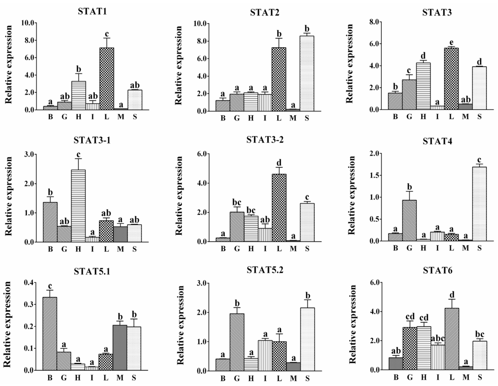 Quantitative PCR (Q-PCR) analysis for expression of STATs across brain (B), gill (G), heart (H), intestine (I), liver (L), muscle (M) and spleen (S) of S. hasta. Data (mean ± SEM, n = 6 specimens, mixed sexes) were expressed relative to expression of housekeeping gene (β-Actin and 18 s rRNA). The expression of STAT5.2 in liver was arbitrarily set as 1, for calculation of relative expression in other tissues. Bars that do not share the same lowercase letter mean significant difference among different tissues (p < 0.05).