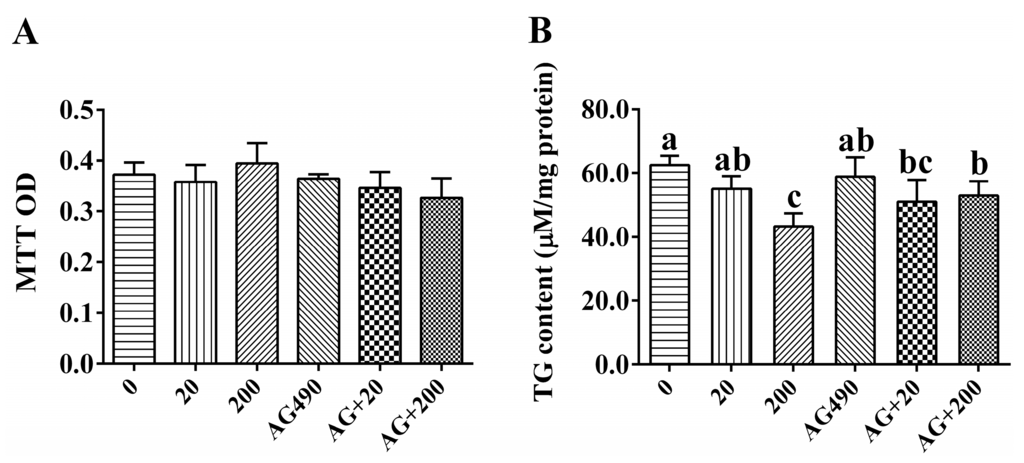 The 3-(4,5-dimethylthiazol-2-yl)-2,5-diphenyltetrazolium bromide (MTT) assay was used to test the cell viability according to our previous in vitro studies [,]. Results were presented as the OD value of each treatment group subtracting the positive group OD value. Intracellular triglyceride (TG) content was determined by glycerol-3-phosphate oxidase p-aminophenol (GPO-PAP) methods, using a commercial kit from Nanjing Jian Cheng Bioengineering Institute, Nanjing, China.