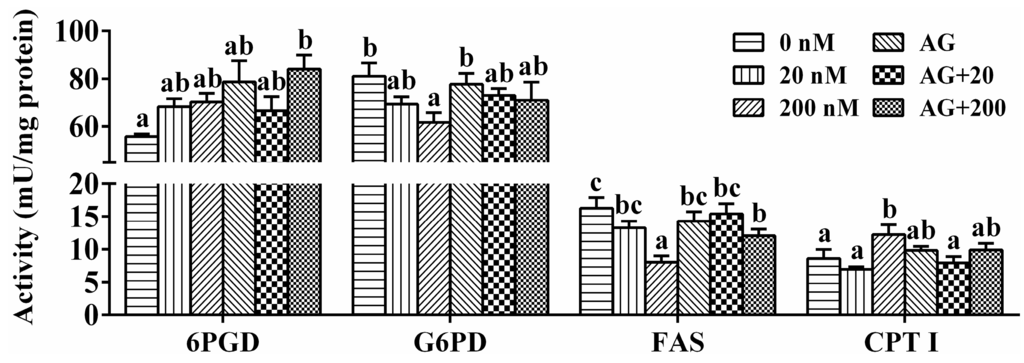 As shown in Figure 5, 20 nM leptin incubation showed no significant effects on enzymatic activities. In contrast, 200 nM leptin improved CPT I activity at 48 h. The activities of G6PD and FAS at the 200 nM leptin group were significantly lower than those in the control group. For all the tested enzymes, single AG490 incubation showed no significant effects on their activities. Compared to single leptin treatment, AG490 pretreatment repressed the changes of G6PD, FAS and CPT I activities.